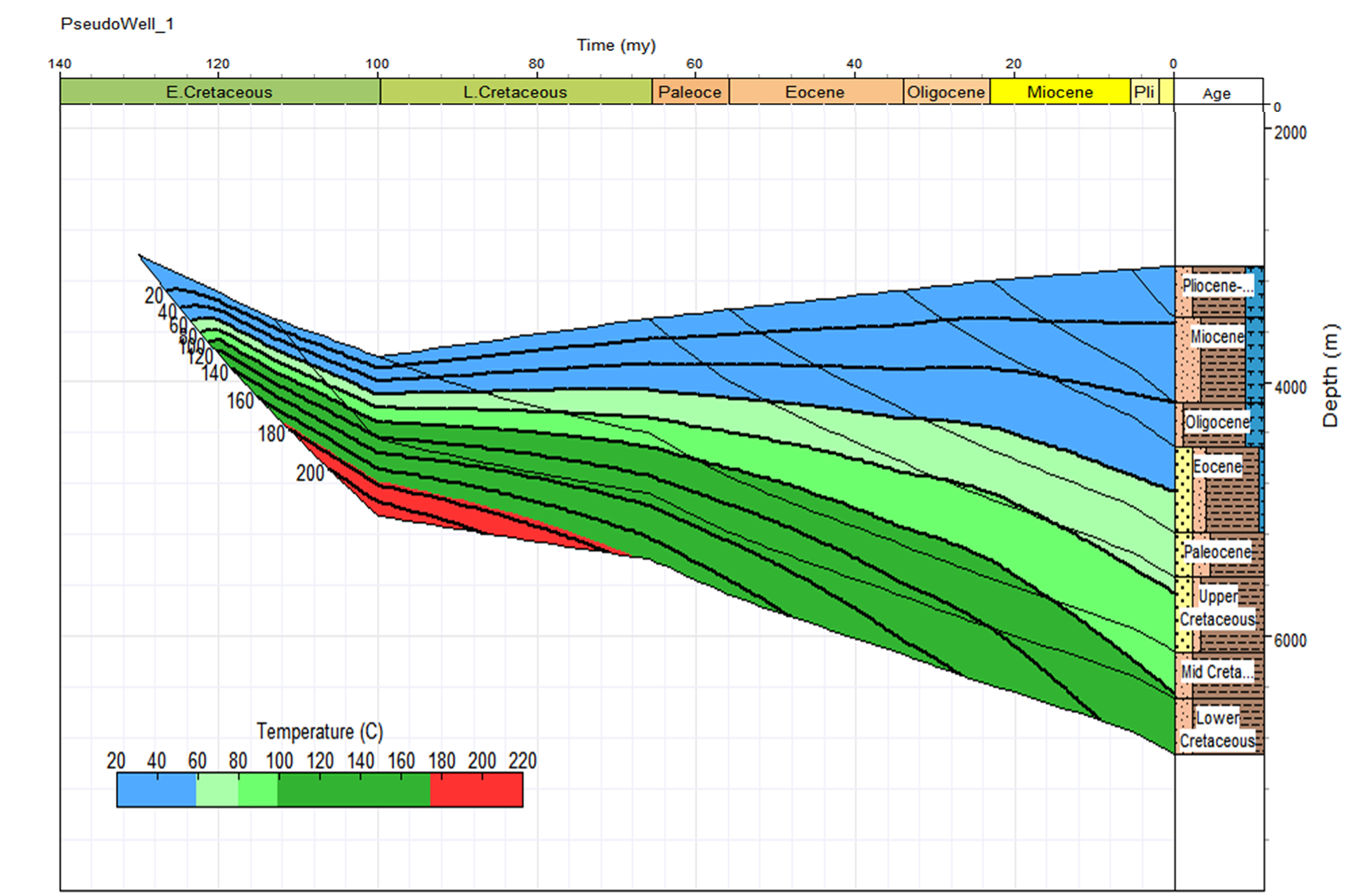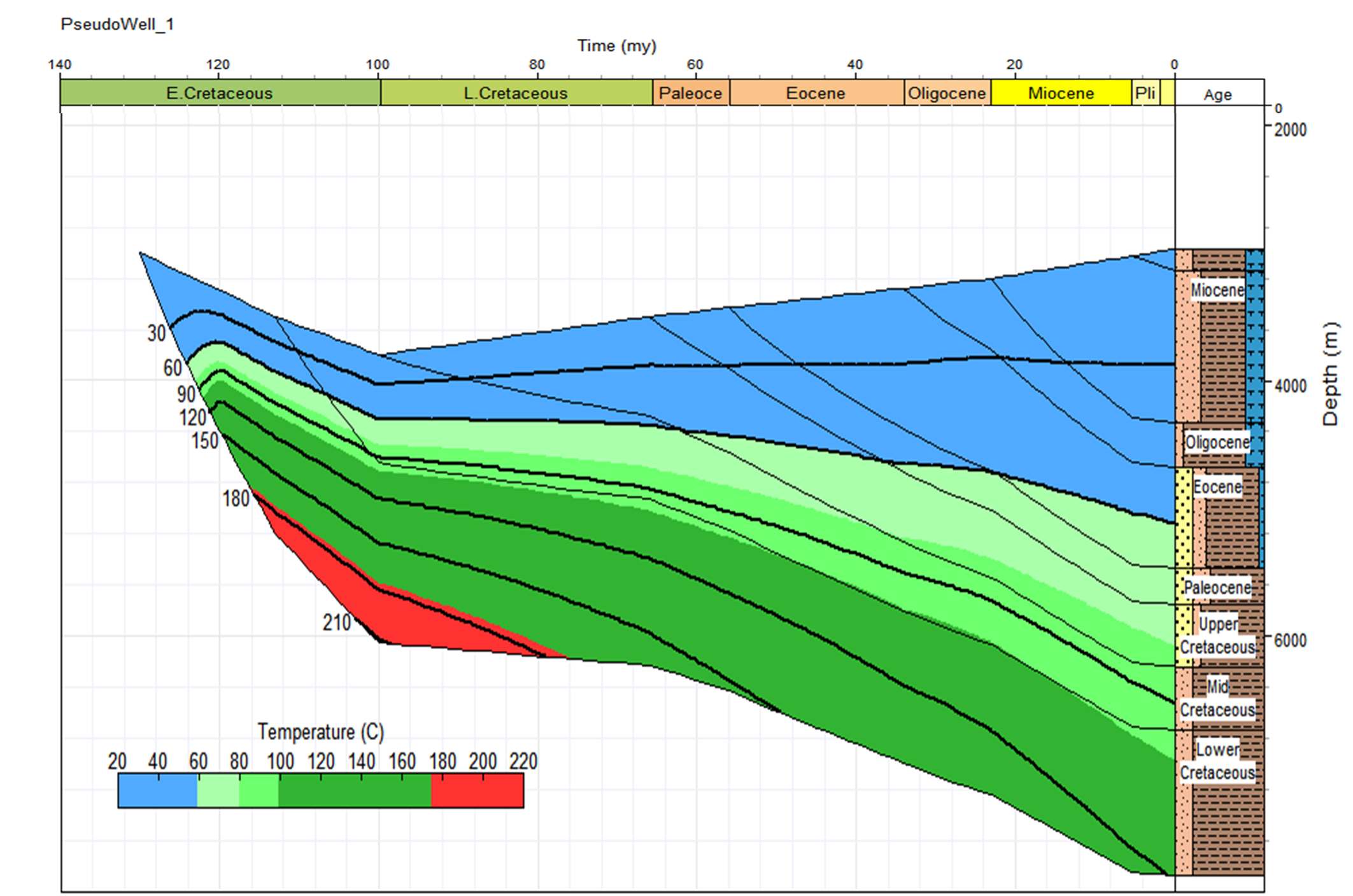 The two burial history charts shown here are for models of a geothermal rift setting in the Comoros, for an off-structure setting above, and for an on-structure one below. These demonstrate that in both models the base of the predicted Lower Cretaceous section is today in the oil window and at peak oil maturity.